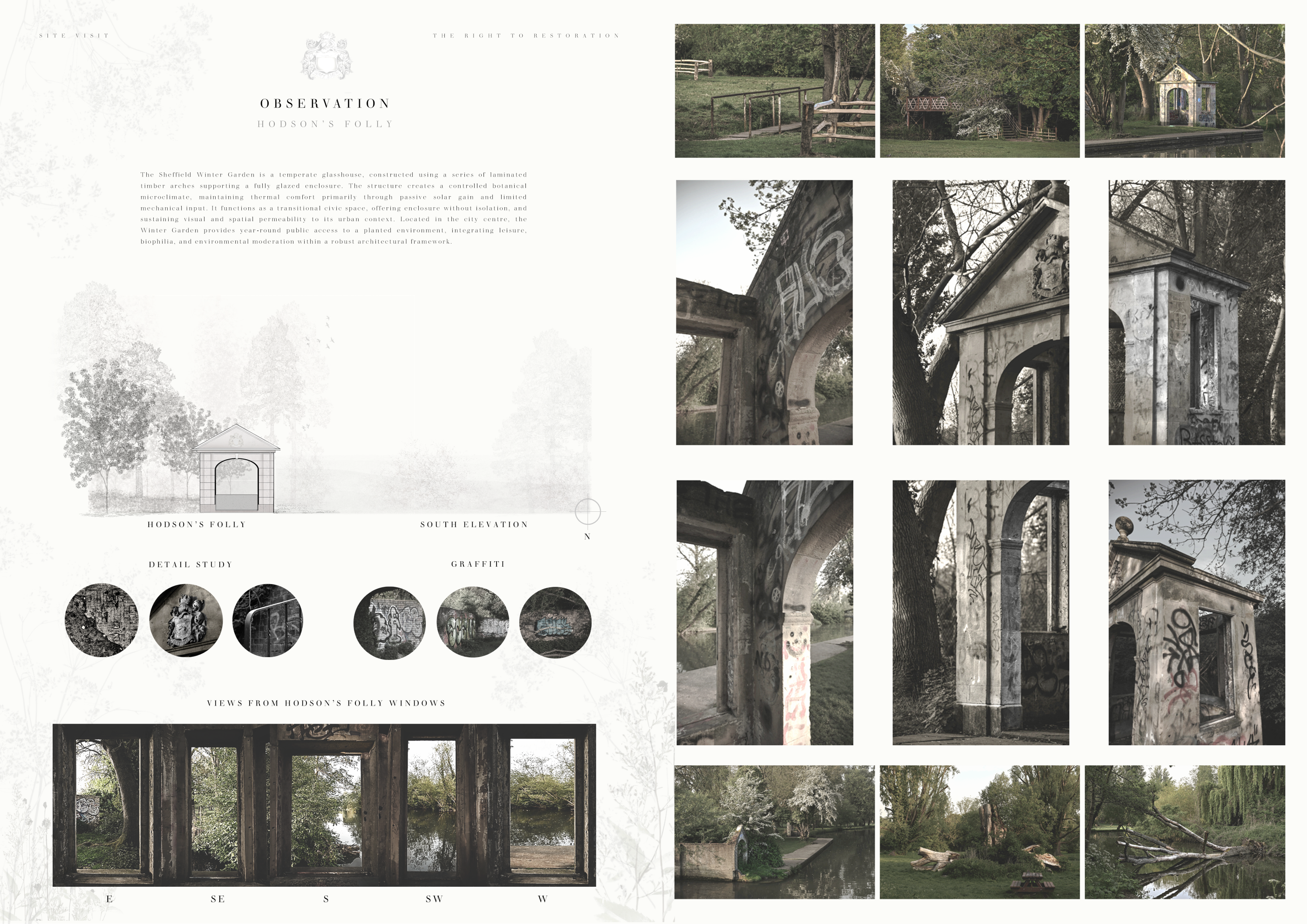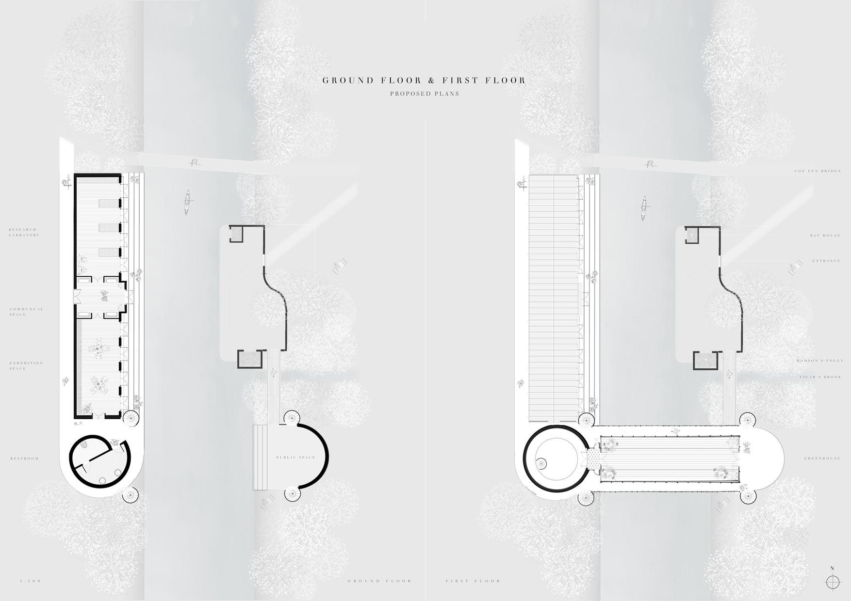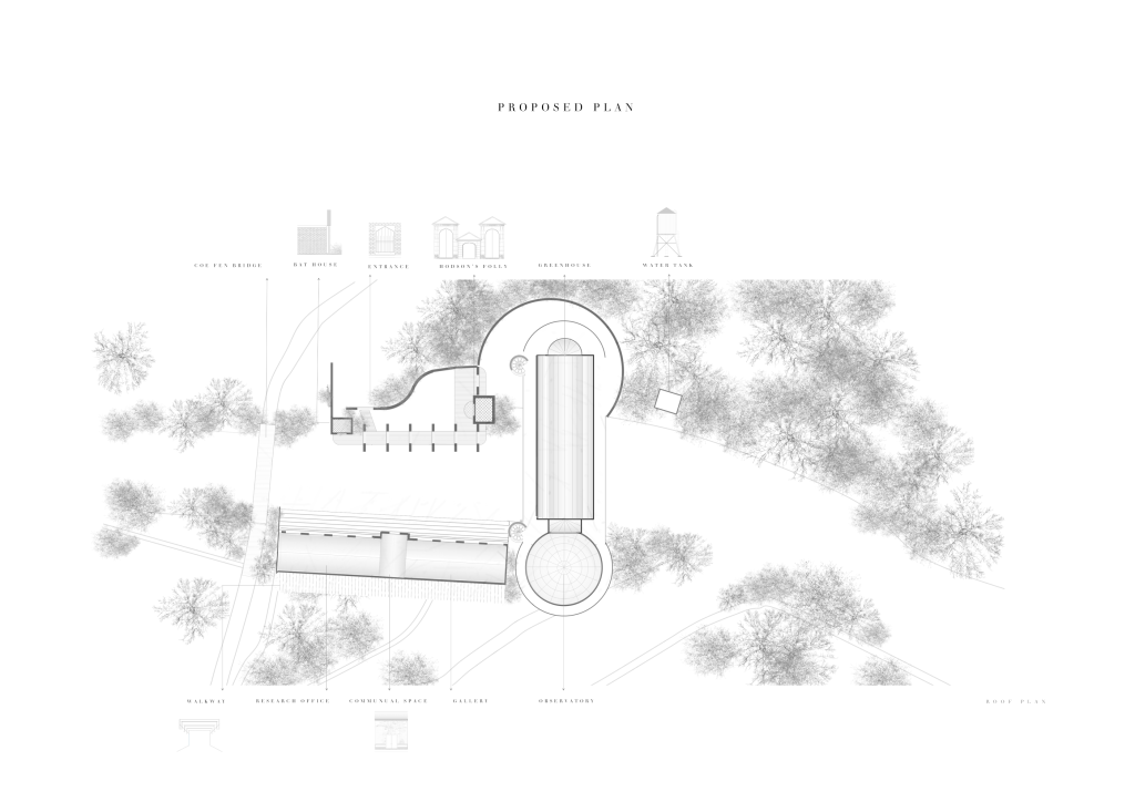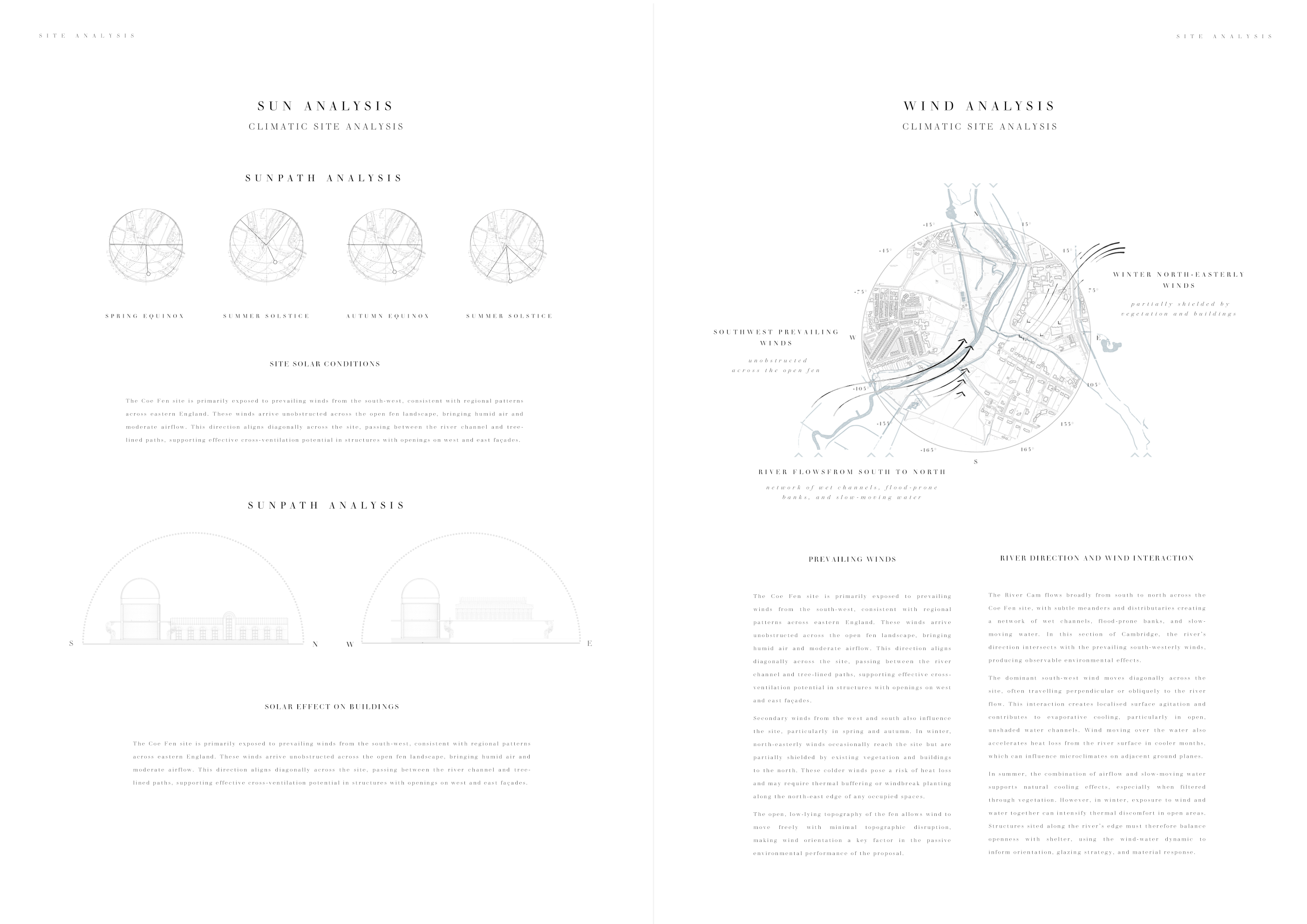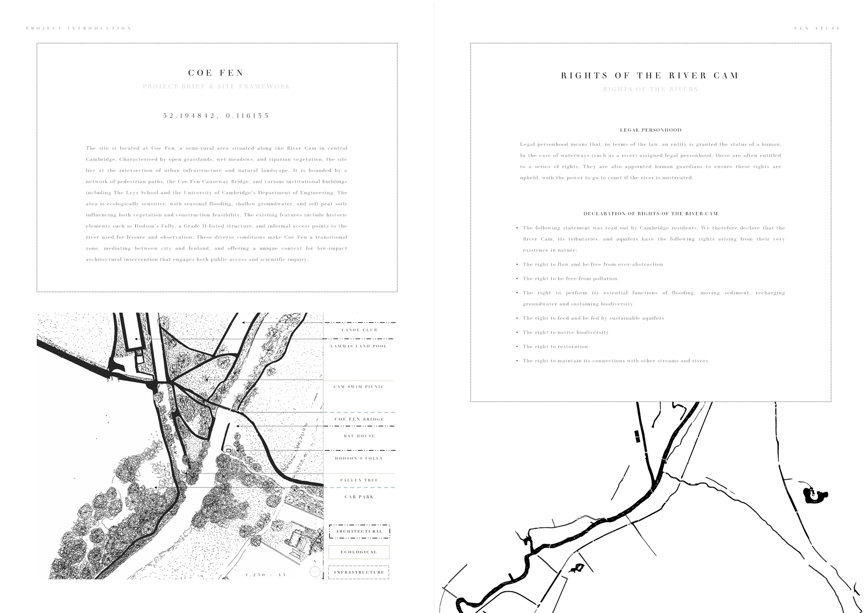 The site is located at Coe Fen, a semi-rural area situated along the River Cam in central Cambridge. Characterised by open grasslands, wet meadows, and riparian vegetation, the site lies at the intersection of urban infrastructure and natural landscape. It is bounded by a network of pedestrian paths, the Coe Fen Causeway Bridge, and various institutional buildings including The Leys School and the University of Cambridge’s Department of Engineering. The area is ecologically sensitive, with seasonal flooding, shallow groundwater, and soft peat soils influencing both vegetation and construction feasibility. The existing features include historic elements such as Hodson’s Folly, a Grade II-listed structure, and informal access points to the river used for leisure and observation. These diverse conditions make Coe Fen a transitional zone, mediating between city and fenland, and offering a unique context for low-impact architectural intervention that engages both public access and scientific inquiry.
