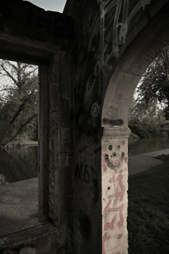 During the site visit, the folly was covered in graffiti and litter and very much in a state of decay. Further research shows the beginning of this decay cycle likely began around 2020, where it is pictured to be entirely free of such vandalism. While in 2022, there was notable progression, much of this has occurred within the last few years. The blue plaque has also since been covered to the extent of illegibility.